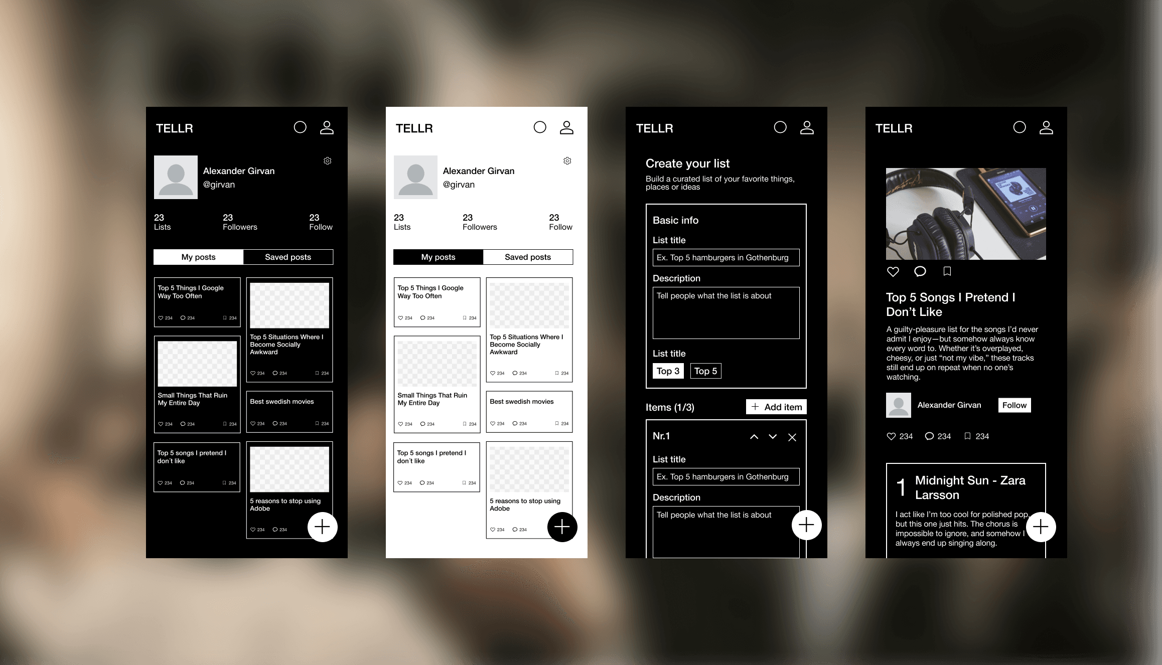 People have interests, opinions and knowledge—but nowhere to share them in a way that feels real. Long articles get ignored, and “universal” opinions feel empty. The question became: where do you actually find taste and insight from people who think like you? TELLR is a place for toplists. Your favorite records. The restaurants worth the detour. Books you'd actually recommend. Whatever you care enough to rank.
